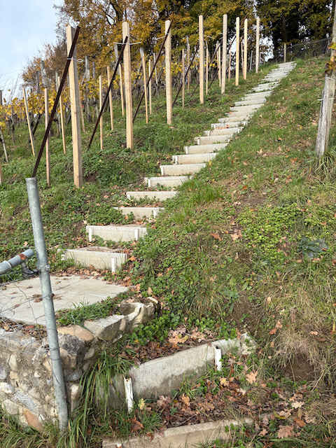 Hinter dem neuen Bauwerk verbirgt sich ein lang gehegter Wunsch für einen trittsicheren und zentralen Zugang zu den obersten Reihen des Rebberges. Das Bord ist steil und insbesondere mit schweren Geräten fürs Mähen oder Spritzen auf den Schultern oder am Rücken nur schwer zu erklimmen.